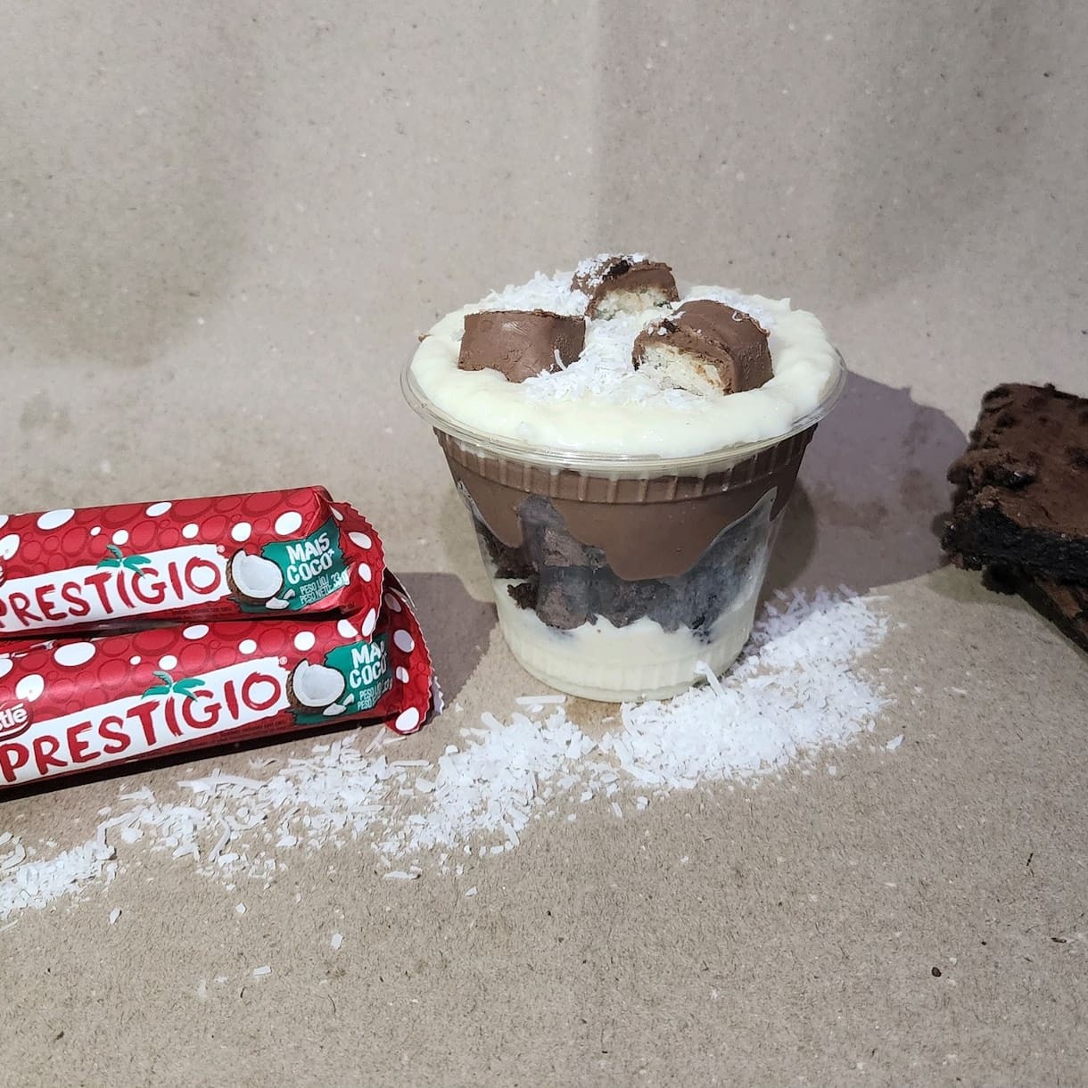 Beijinho, brownie, brigadeiro 50% cacau, coco ralado e Prestígio