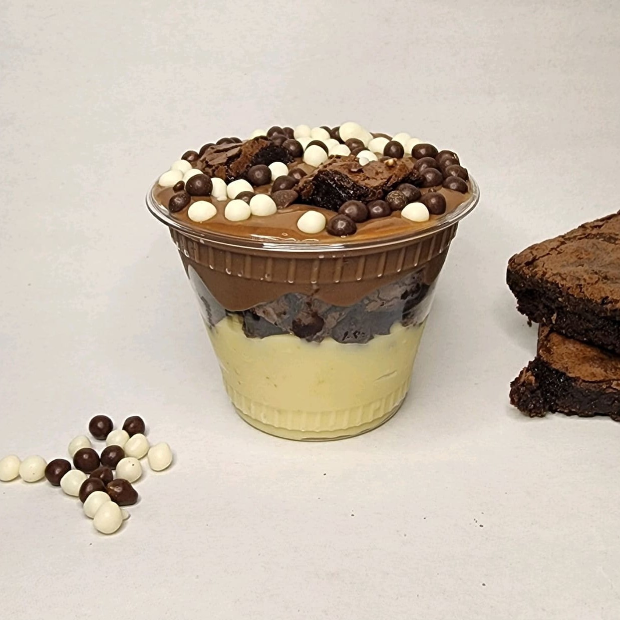 Brigadeiro branco, brownie, morangos frescos e brigadeiro 50% cacau