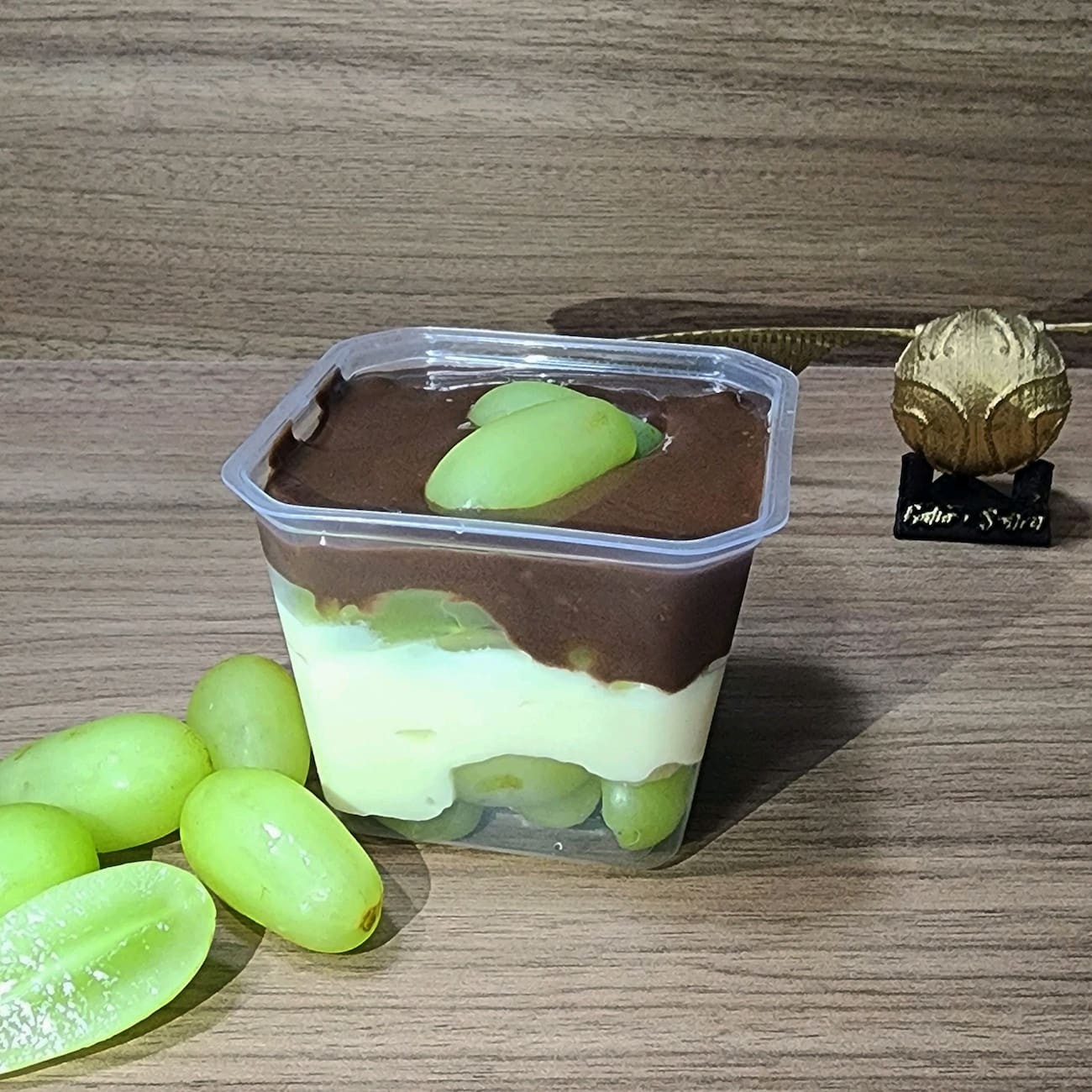 Creme branco, uvas verdes frescas e sem semente e ganache de chocolate meio amargo