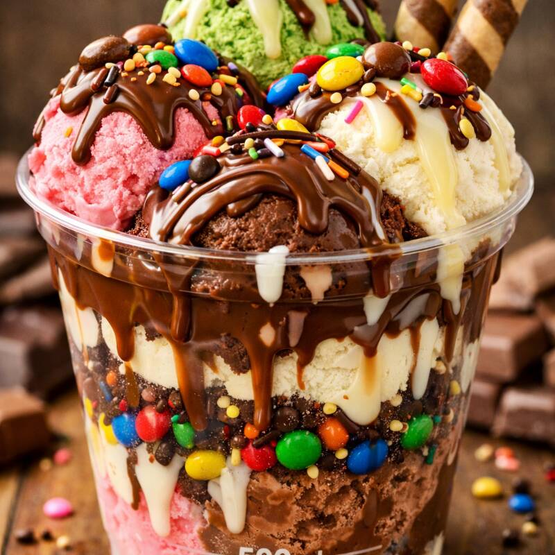 O dobro não basta, vai de triplo! 3 bolas a sua escolha + 2 complemento, finalize com cobertura gratis e transforme seu momento em pura explosão de amor. (copo de 330ml)