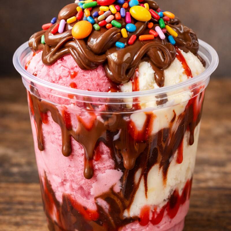 O Dobro do sabor no ponto! 2 bolas a sua escolha + 1 complemento especial. Finalize com cobertura grátis e deixe ainda mais irresistivel. (copo 250 ml)