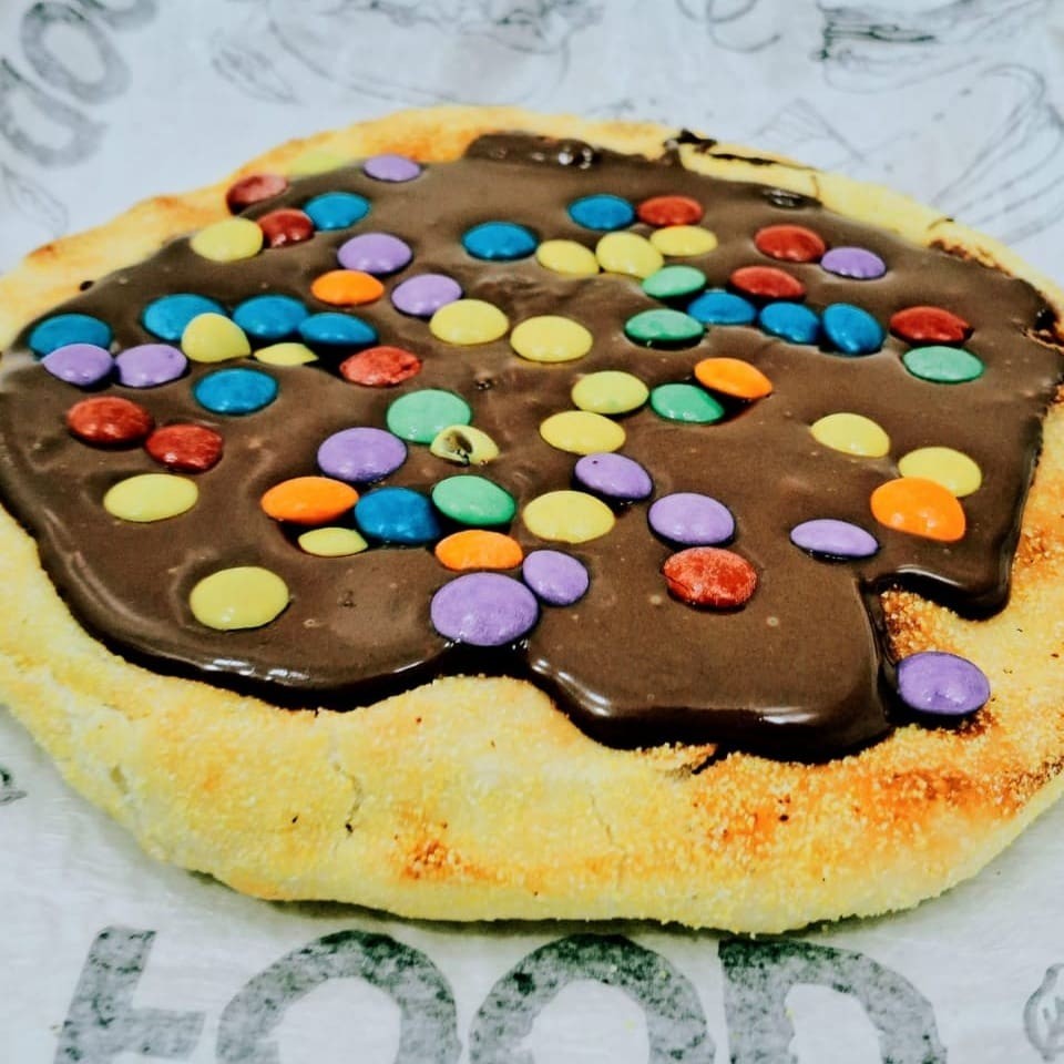 Esfiha Aberta artesanal de 12cm, feita a partir de farinha de trigo especial, longa fermentação, recheio com creme de avelã, finalizado com confetes de chocolate coloridos.
