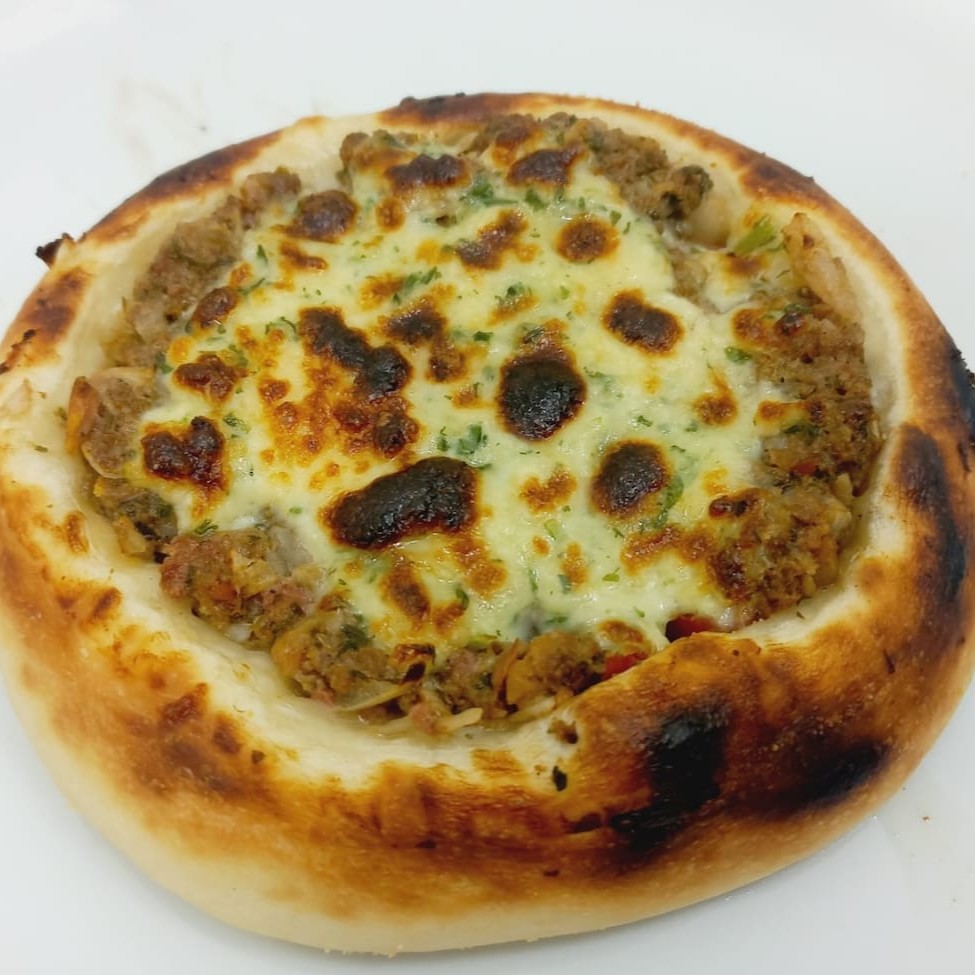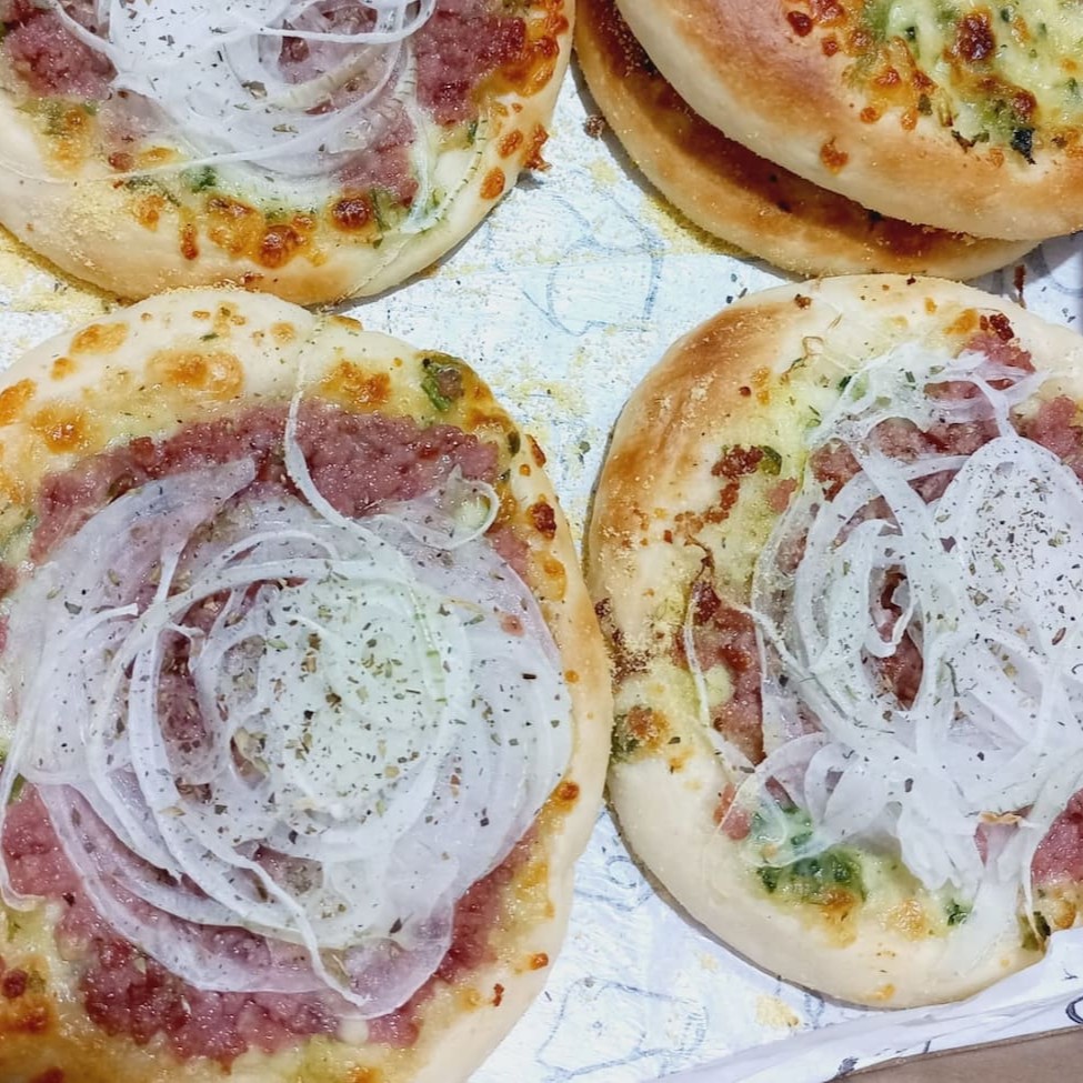 Esfiha Aberta artesanal de 12cm, feita a partir de farinha de trigo especial, longa fermentação, recheio com calabresa, com um mix de queijos, artezanais, cebola em rodelas finas marinadas em azeite extra virgem e orégano.