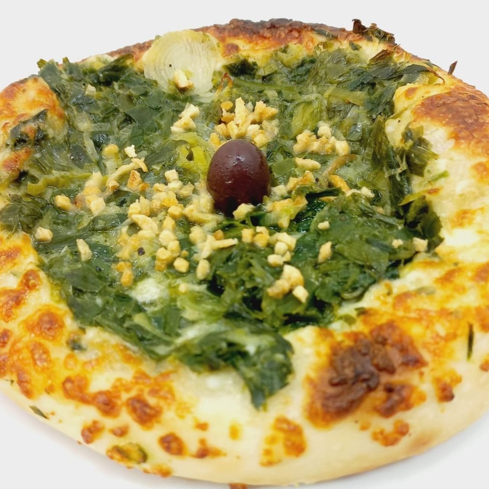 Esfiha Aberta artesanal de 12cm, feita a partir de farinha de trigo especial, longa fermentação, recheio com Alho Poró e um mix de queijos artezanais, finalizada com alho torrado e uma azeitona portuguesa.