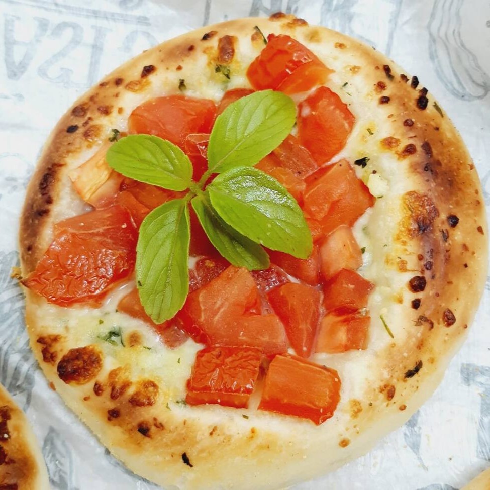 Esfiha Aberta artesanal de 12cm, feita a partir de farinha de trigo especial, longa fermentação, recheio com um mix de queijos produzidos artesanalmente, tomate, manjericão fresco e especiarias.