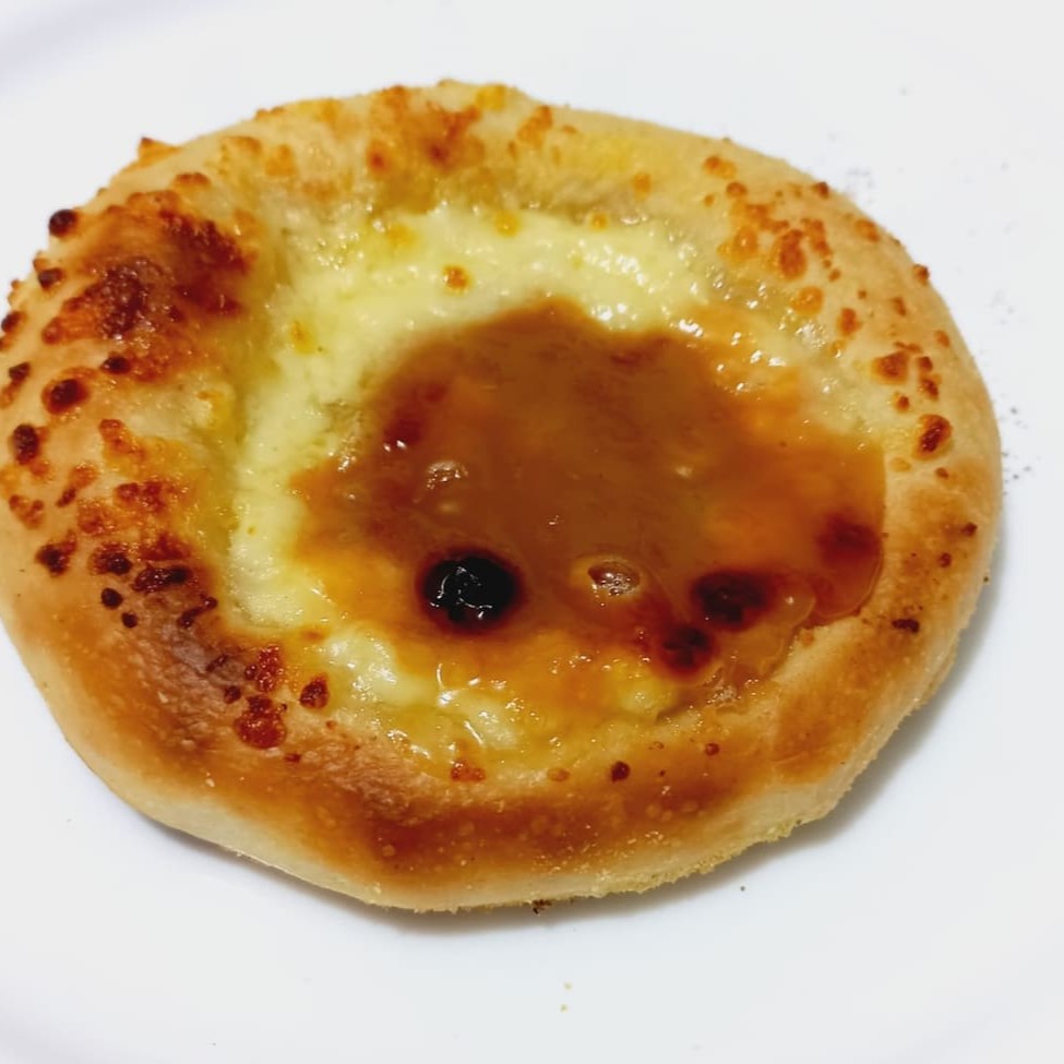Esfiha Aberta artesanal de 12cm, feita a partir de farinha de trigo especial, longa fermentação, recheio com doce de leite e um mix de queijos artezanais da casa.