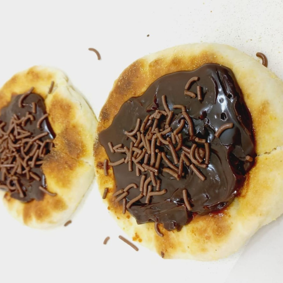 Esfiha Aberta artesanal de 12cm, feita a partir de farinha de trigo especial, longa fermentação, recheio com brigadeiro de chocolate, finalizado com chocolate granulado.