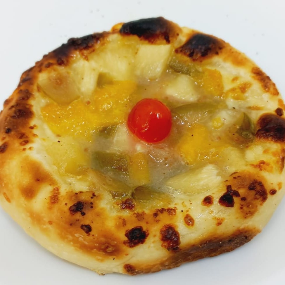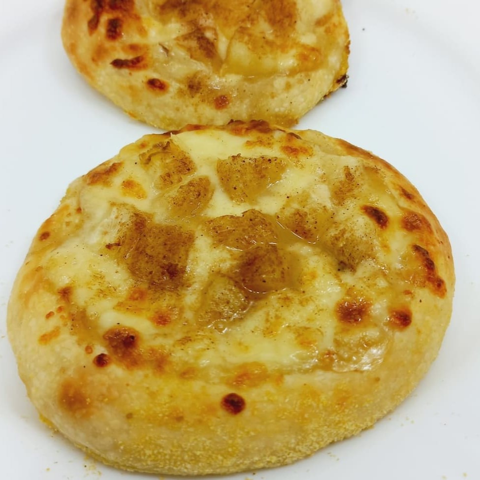 Esfiha Aberta artesanal de 12cm, feita a partir de farinha de trigo especial, longa fermentação, recheio com cubos de abacaxi natural com um mix de queijos artezanais da casa e finalizado com canela e açucar demerara.
