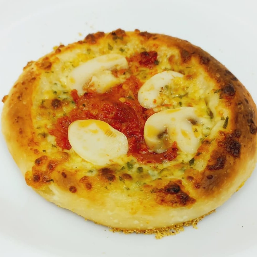 Esfiha Aberta artesanal de 12cm, feita a partir de farinha de trigo especial, longa fermentação, recheio com um mix de queijos especiais da casa, Champignon, tomate seco picado e especiarias