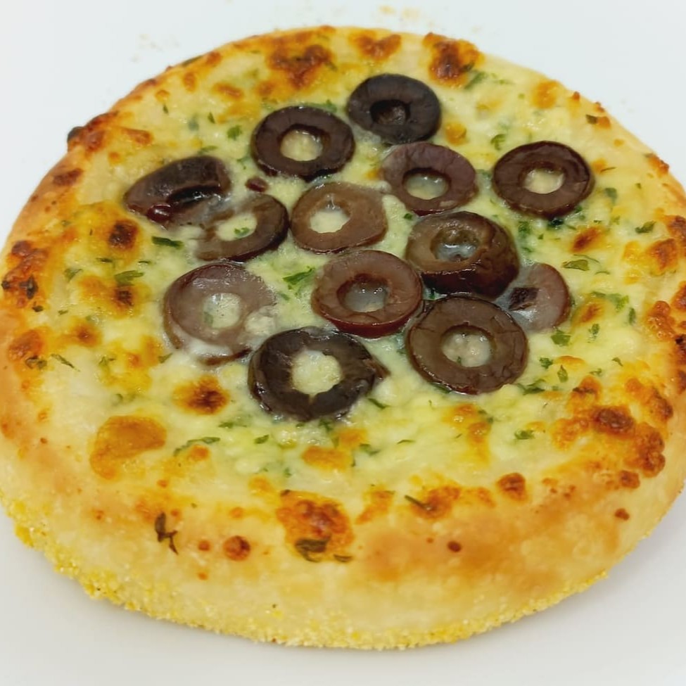 Esfiha Aberta artesanal, feita a partir de farinha de trigo especial, longa fermentação, recheio com um mix de queijos especiais da casa e azeitonas pretas em rodelas e especiarias,