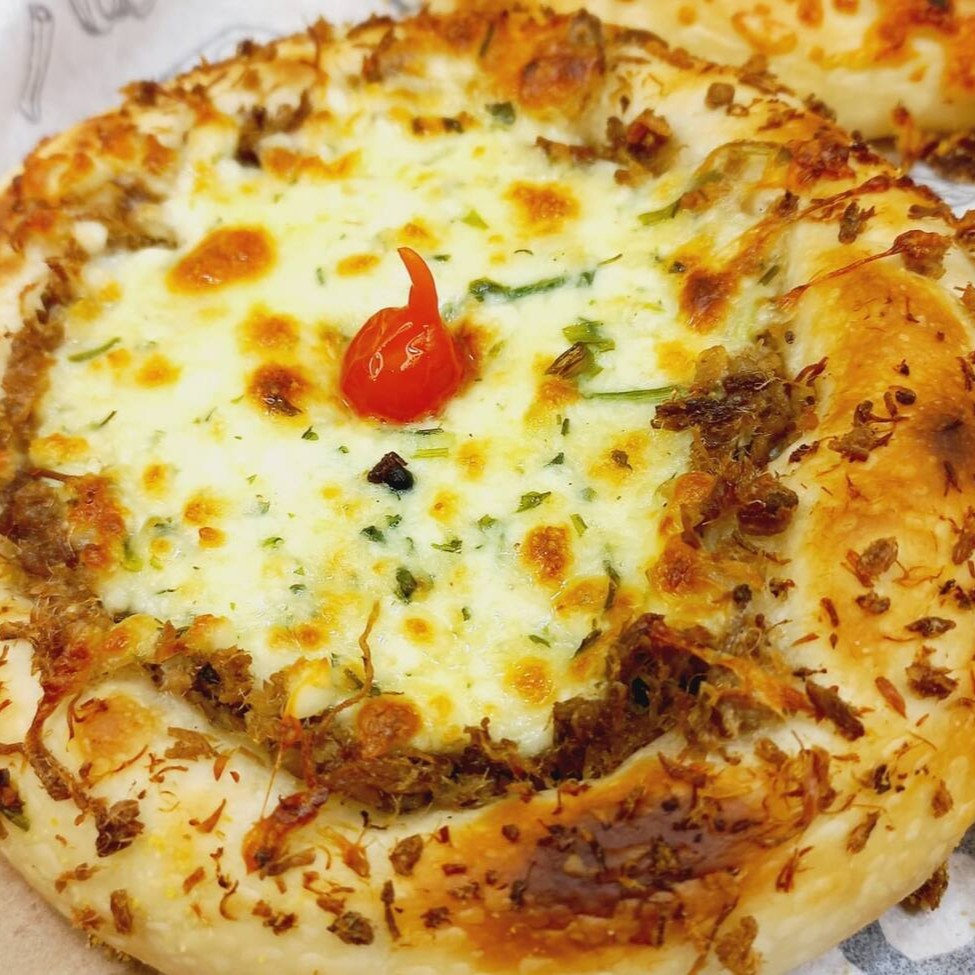 Esfiha Aberta artesanal de 12cm, feita a partir de farinha de trigo especial, longa fermentação, recheio de carne com temperos do Choco, e um mix de queijos artesanais.