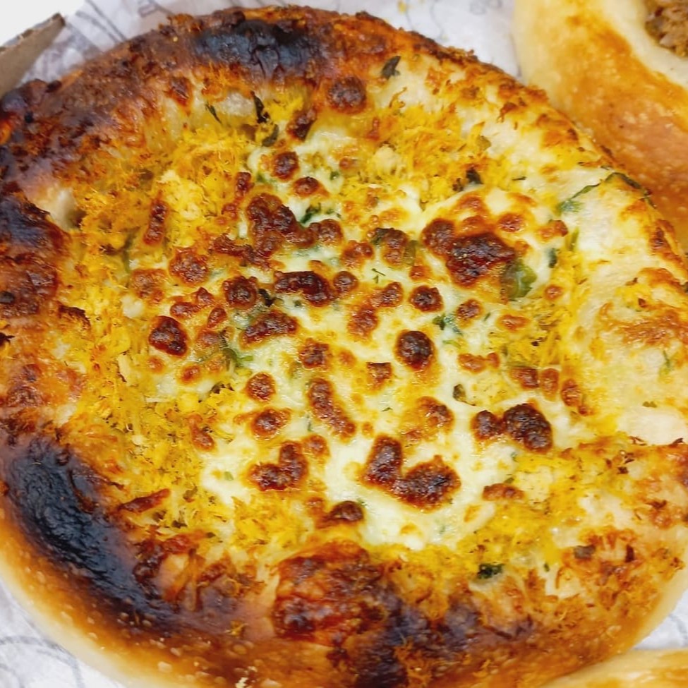 Esfiha Aberta artesanal de 12cm, feita a partir de farinha de trigo especial, longa fermentação,recheio de frango desfiado e temperado com ervas e especiarias, como páprica, orégano, cúrcuma e um mix de queijos especiais da casa.( duas camadas de queijo )