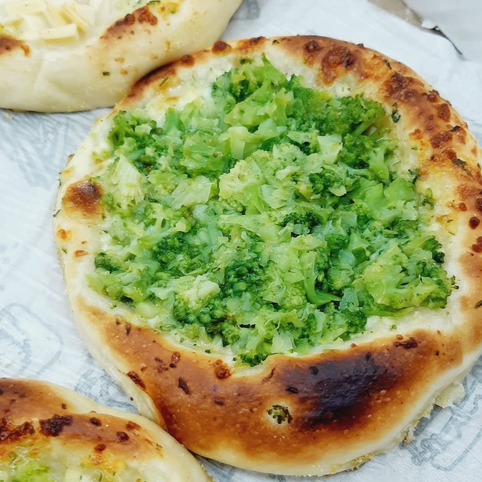 Esfiha Aberta artesanal de 12cm, feita a partir de farinha de trigo especial, longa fermentação, recheio com brócolis e um mix de queijos artezanais.