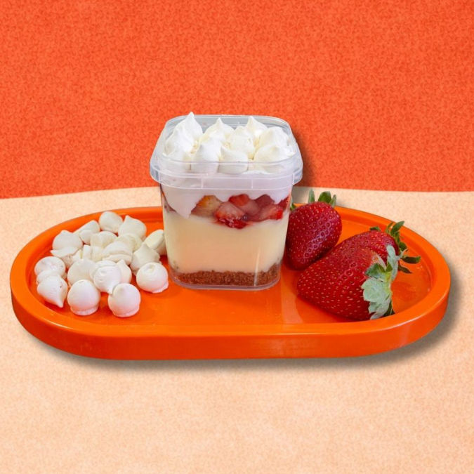 Brigadeiro de ninho, com farofinha artesanal de bolacha, morango fresco, chantininho e suspiro. Peso médio - 250g. O produto é perecível, com a validade para o mesmo dia - consumo imediato.