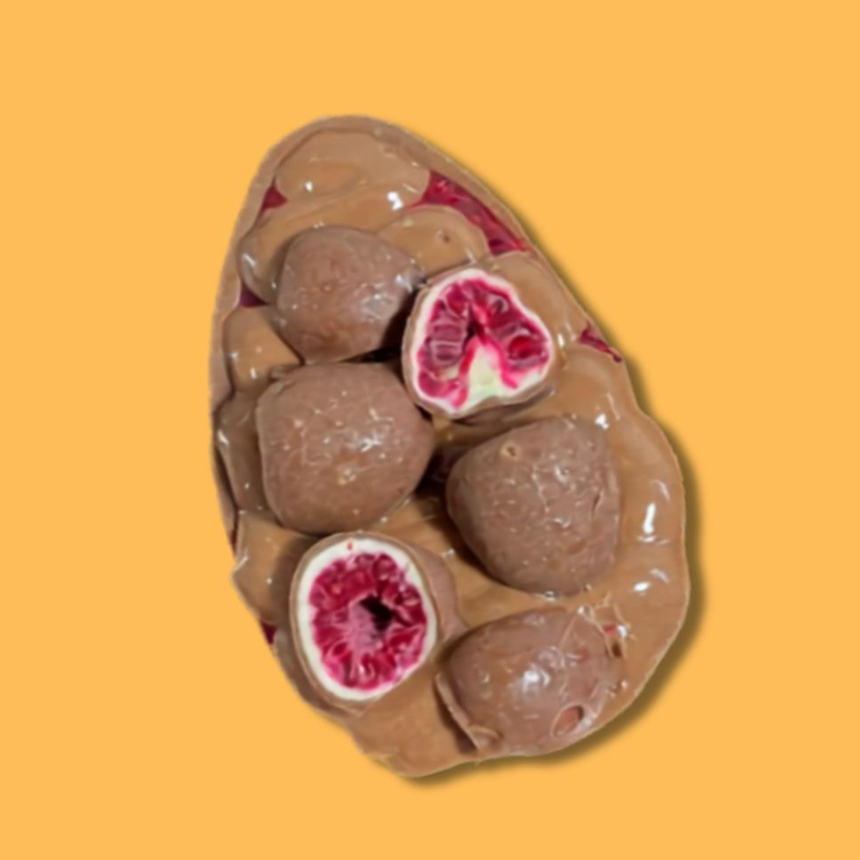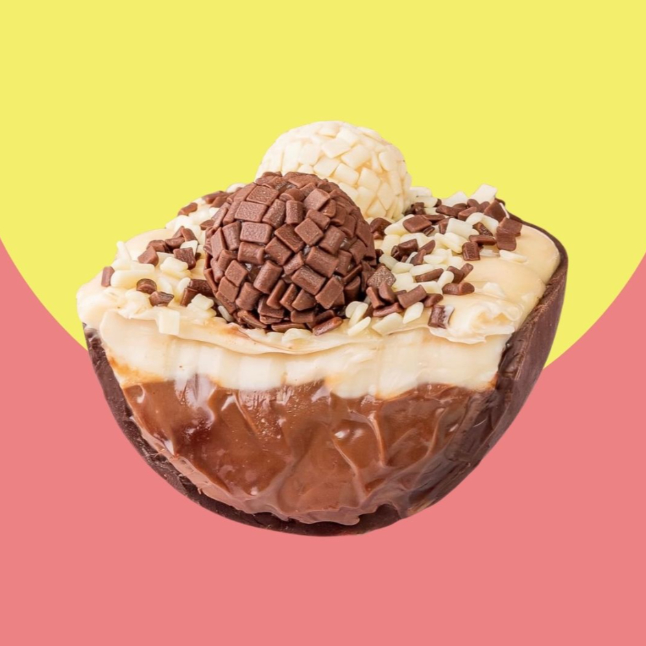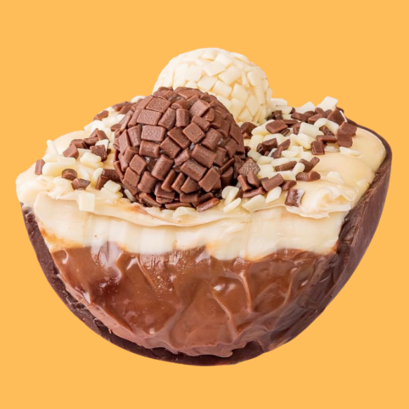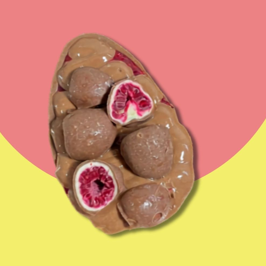 Casca de chocolate nobre ao leite + brigadeiro de ninho + geleia artesanal de framboesa + brigadeiro de chocolate + FRANUÍ