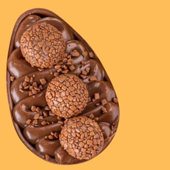 Feito com chocolate nobre ao leite, recheado com muito brigadeiro cremoso de chocolate e ninho e finalizado com brigadeiros e confeitos de chocolate nobre