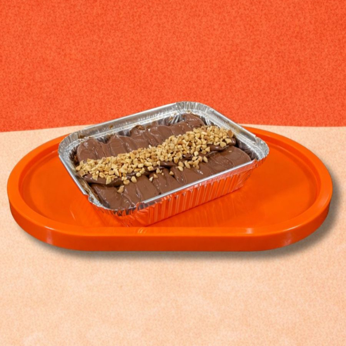 Massa com cacau de qualidade, chocolate meio amargo nobre e farinha premium. Casquinha perfeita, interior bem molhadinho. Cobertura de brigadeiro de leite ninho e brigadeiro de chocolate blend nobre + confeito de chocolate nobre. Aprox 160g.