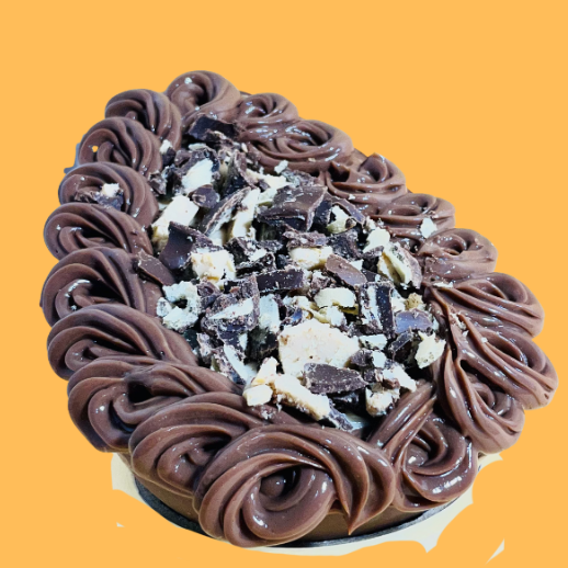 Feito com chocolate nobre ao leite, recheado com creme de chocolate intenso, creme sonho de valsa e decorado com pedaços do bombom triturado