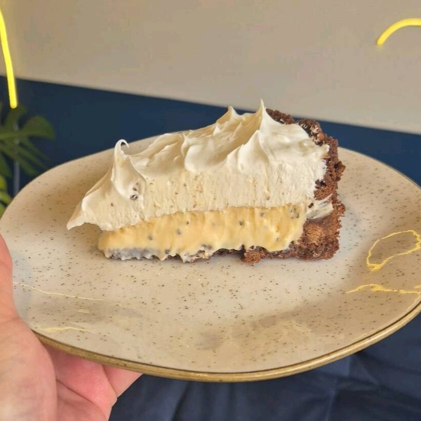 base de biscoito de chocolate, mouse de maracujá e marshmallow tostado.