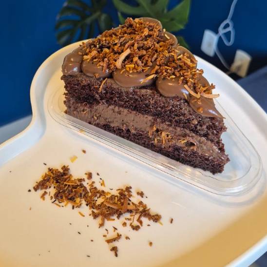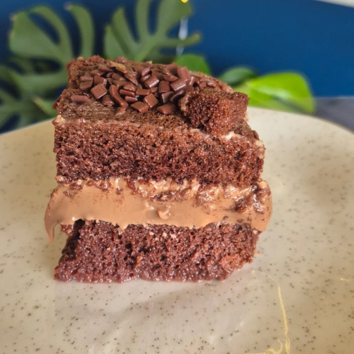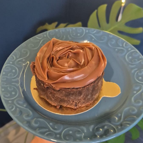 Massa de chocolate com brigadeiro, caramelo e coco queimado.