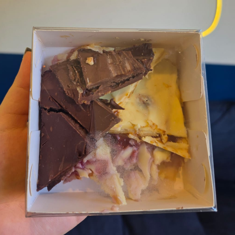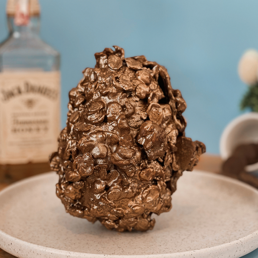Casca cravejada de chocolate ao leite com sucrilhos caramelizado, trufado com ganahe e Whisky Jack Daniel´ honey