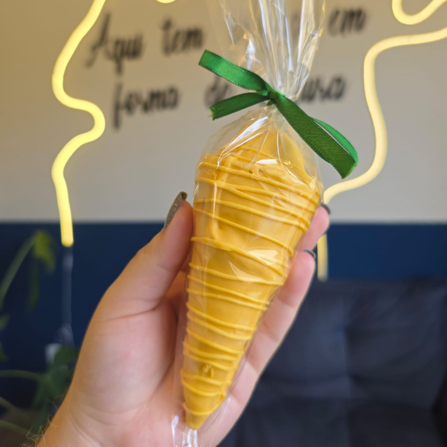 Cone recheao com brigadeiro belga e banhado no chocolate nobre branco.