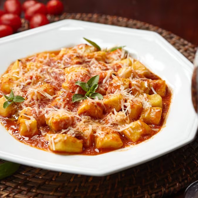 Acompanha arroz e Nhoque molho Sugo.