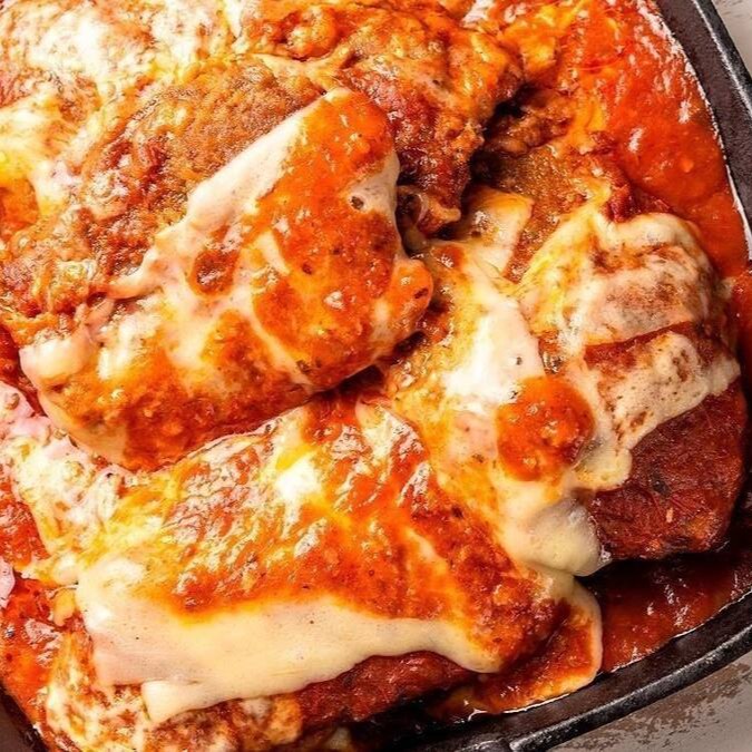 360gr de Peito de frango. Empanado e frito. Coberto com molho de tomate Da casa e muuuito queijo. Acompanha porção de Arroz branco + batata frita.