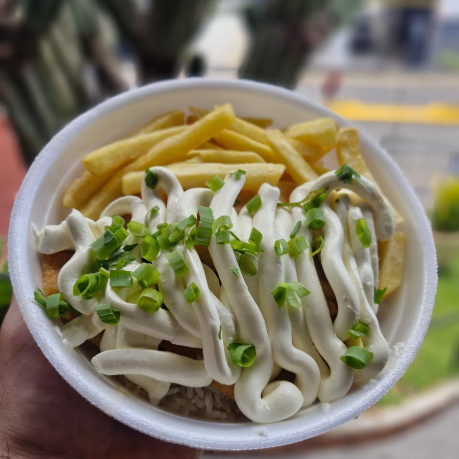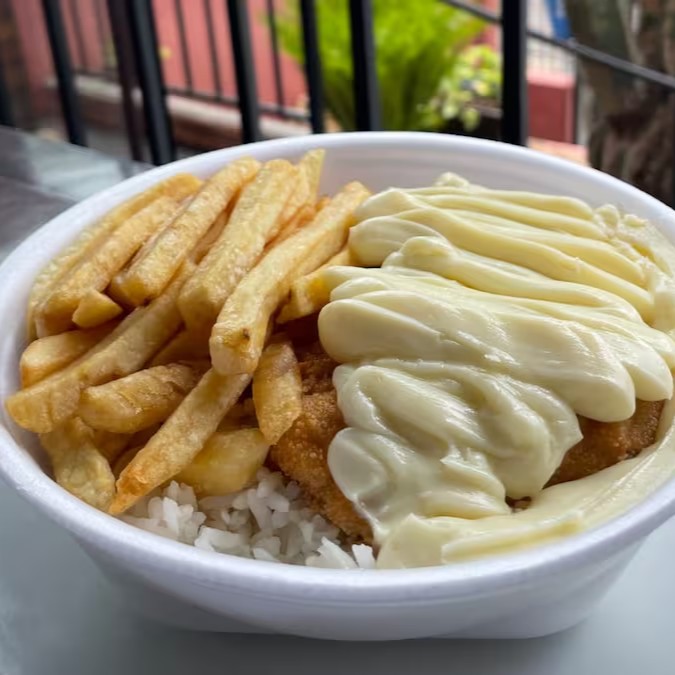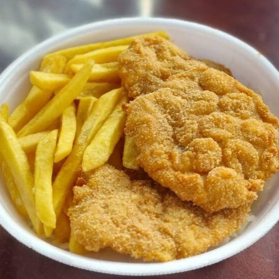 Arroz branco soltinho, feijão fresquinho, batata frita e Frango á milanesa e catupiry original.