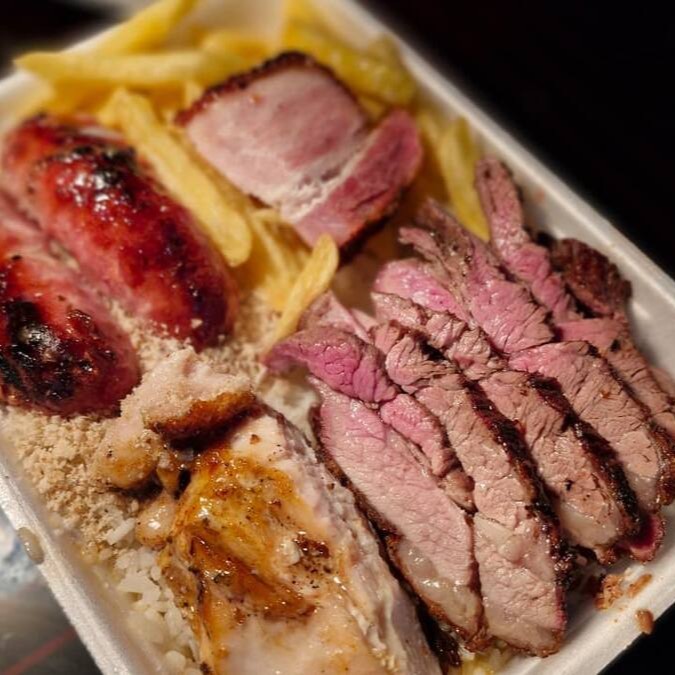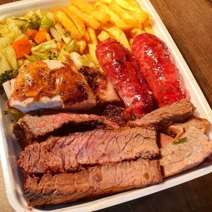 Acompanha: Arroz branco, feijão, farofa, batata frita e Churrasco ( carne, linguiça e frango)