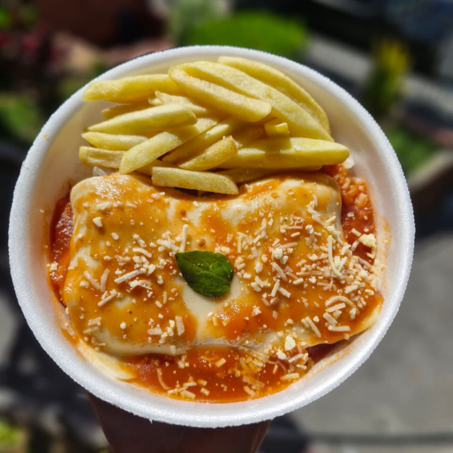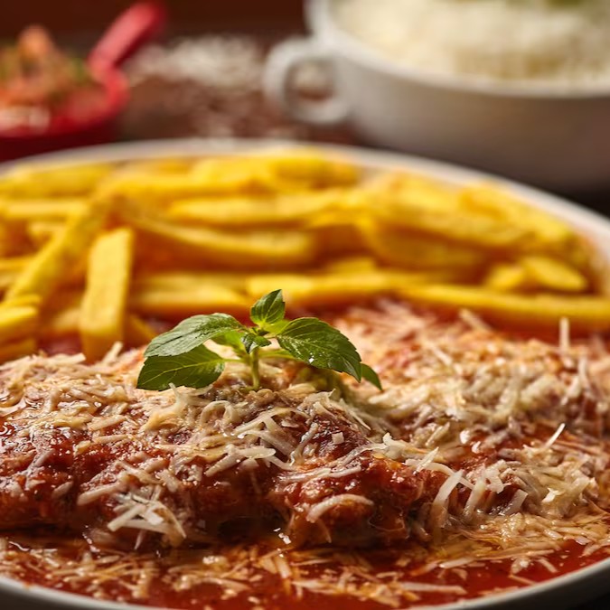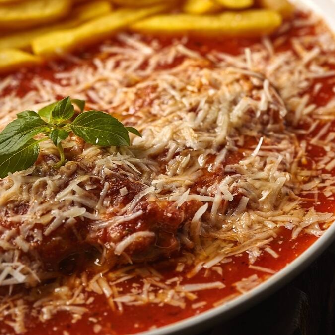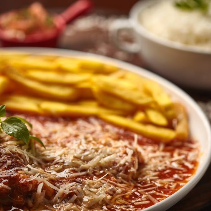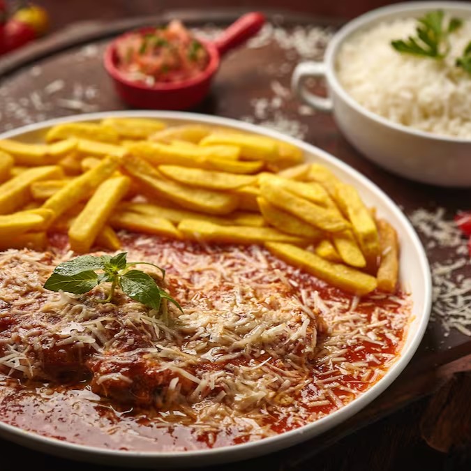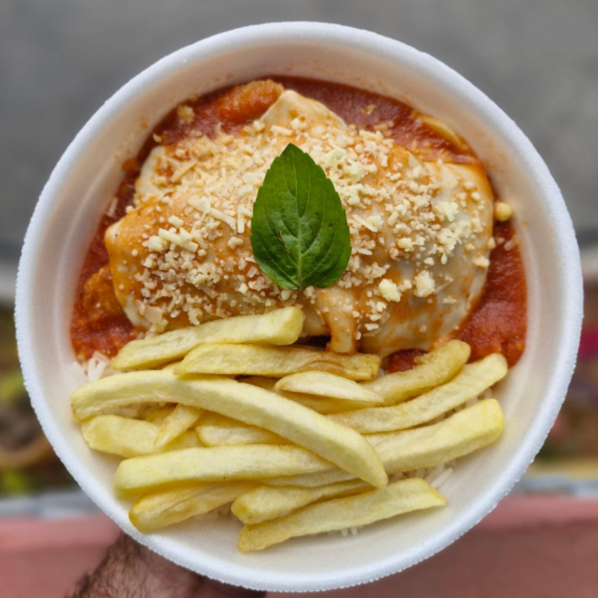 Arroz branco fresquinho, batata frita, Frango á milanesa, molho de tomate da casa, manjericão e queijo musarela e parmesão.