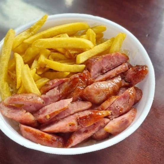 Linguiça na brasa, arroz branco, feijão fresquinho + Batata frita.