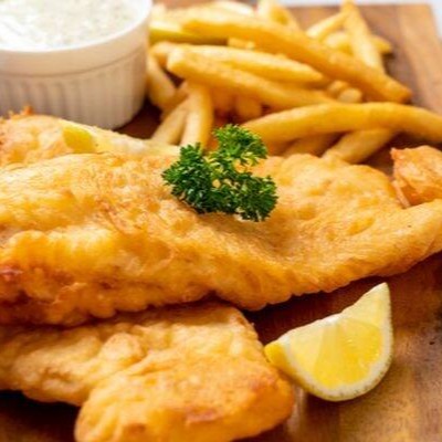 Filé de Tilápia (Saint peter) 150gr Empanada, frita em imersão. Coberta com molho de tomate E muito queijo Acompanhada de Arroz branco e Batata frita.