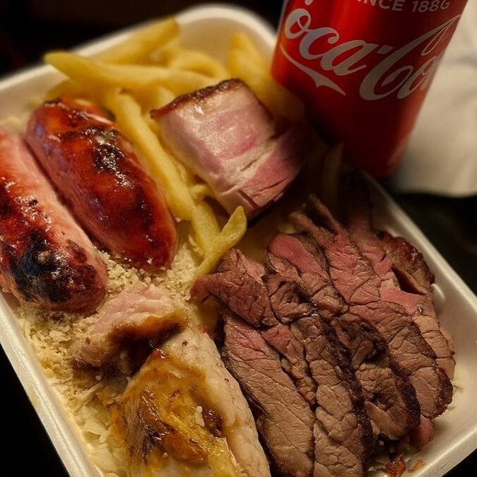 Acompanha: Arroz branco, feijão, farofa, batata frita e Churrasco ( carne, linguiça e frango) + uma coca cola lata.
