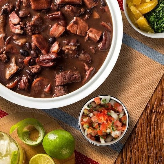 Nossa feijoada é feita com bacon, costelinha defumada, carne seca calabresa e paio. O prato de feijoada é acompanhado de arroz branco, farofa, couve com bacon, torresmo e vinagrete. Sábado Feijoada Caipirinha Quarta feira Serve muito bem 1 pessoa.