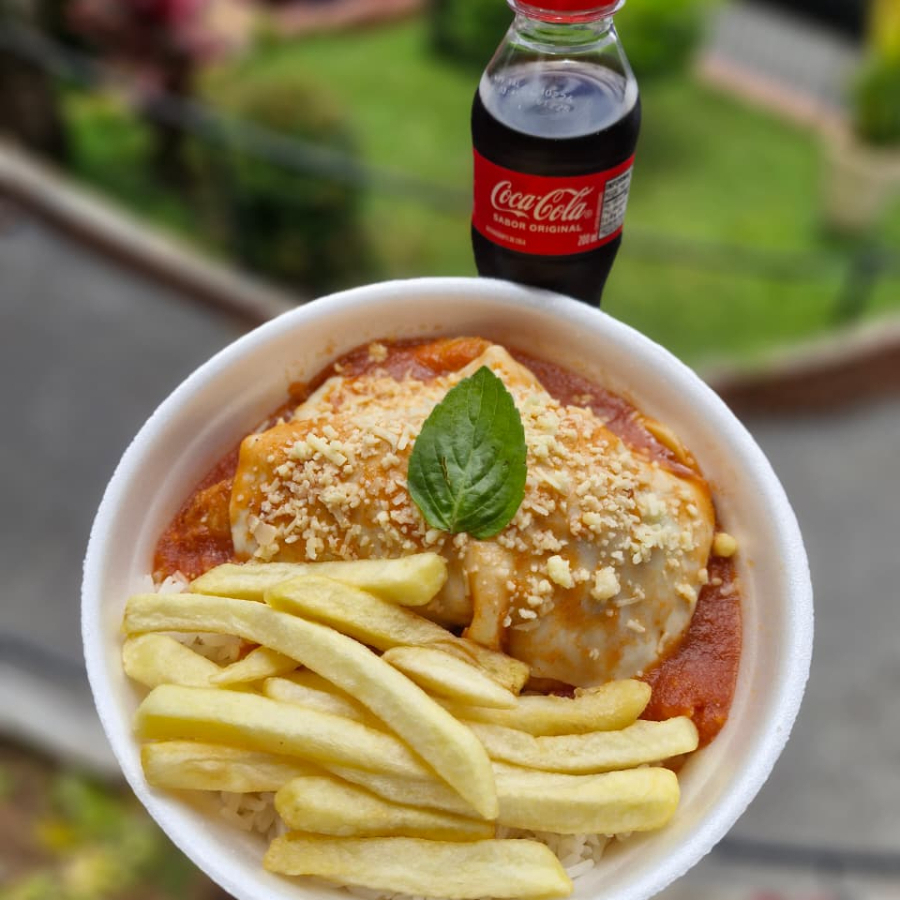 Arroz branco fresquinho, batata frita, Frango á milanesa, molho de tomate da casa, manjericão e queijo musarela e parmesão. + uma coca cola lata. Marmita