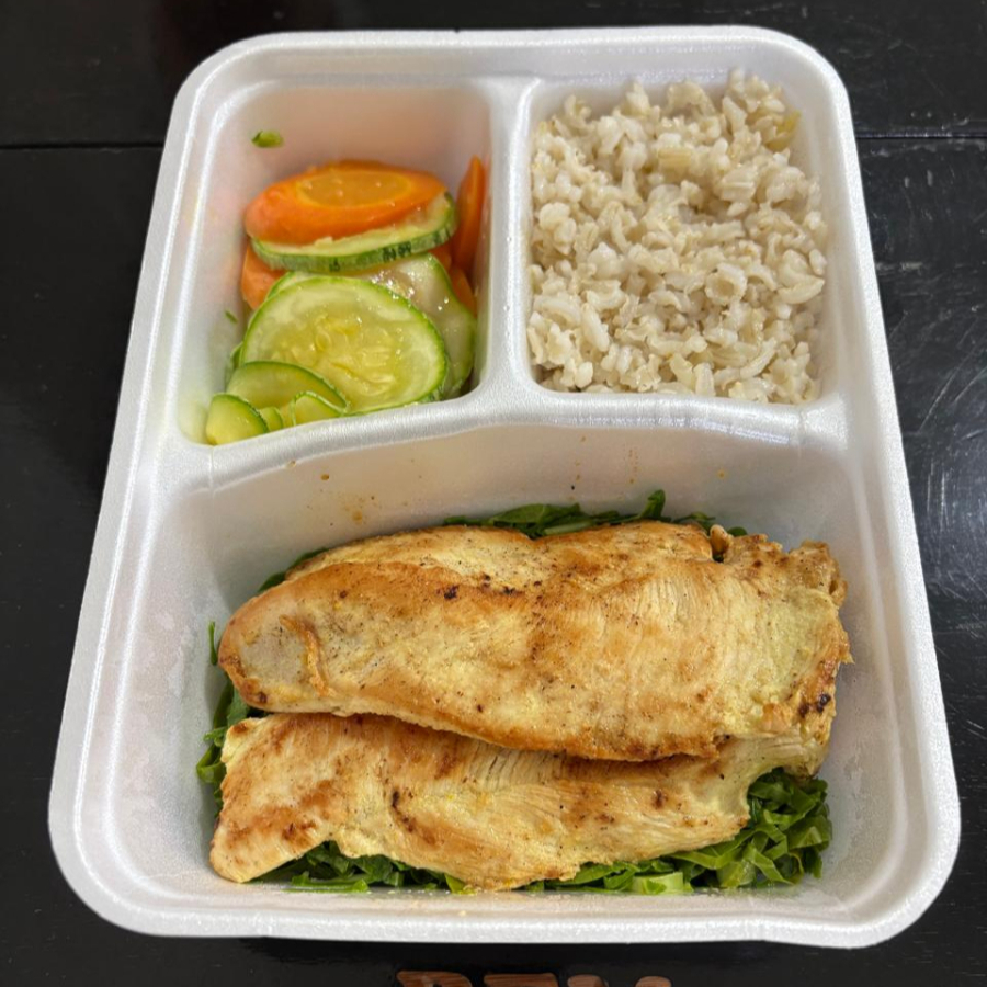 arroz integral, legumes salteados, couve, 130 gr file de frango grelhado
