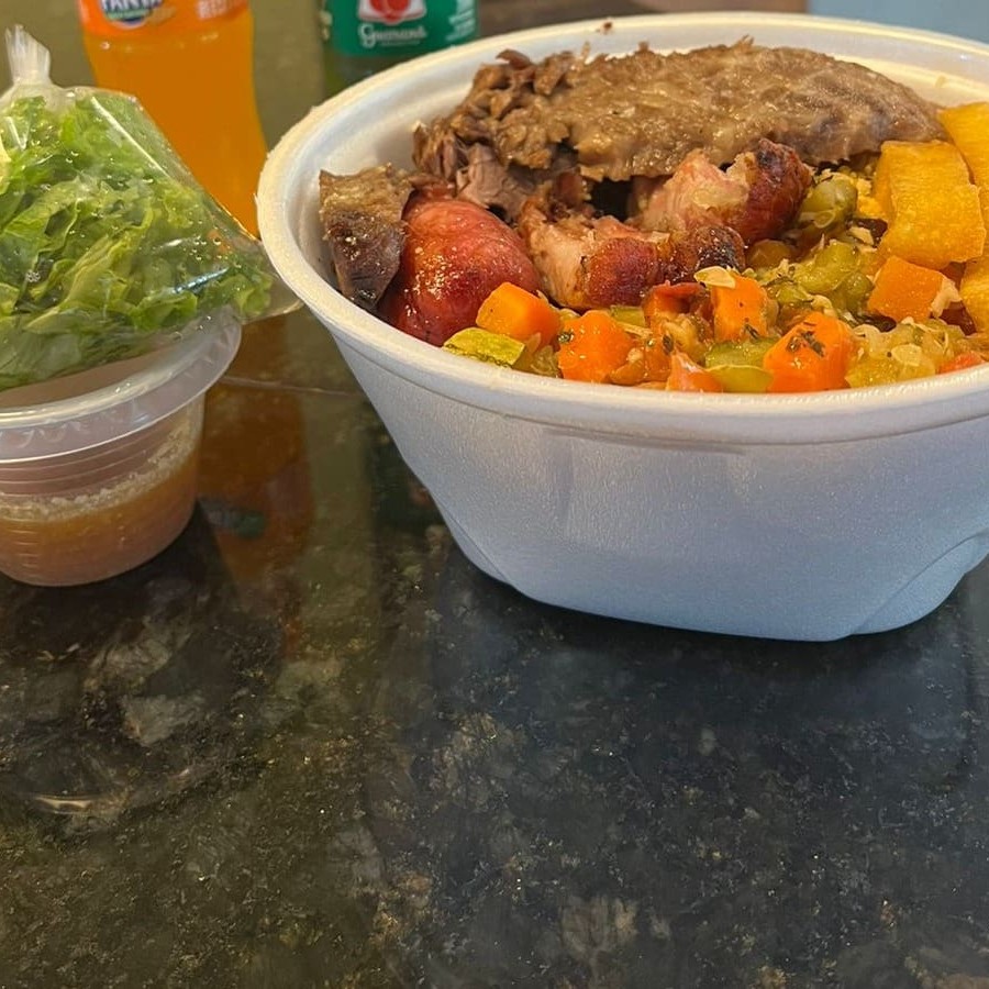 Arroz, Feijão, Linguiça, Refogado, Fritas, Salada e Sobremesa.