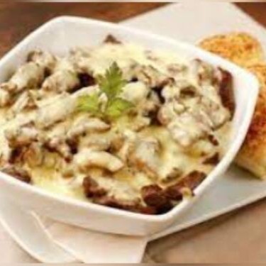 Arroz, Feijão, Carne com gorgonzola, Refogado, Fritas, Salada e Sobremesa.