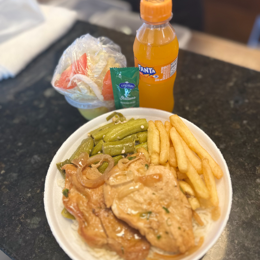 Arroz, Feijão, filé de peixe empanado , Farofa, Refogado, Fritas, Salada e Sobremesa + Fanta Laranja 350 ml