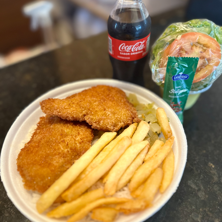 Arroz, Feijão, Filé de frango grelhado, Farofa, Refogado, Fritas, Salada e Sobremesa + Coca Cola 350 ml