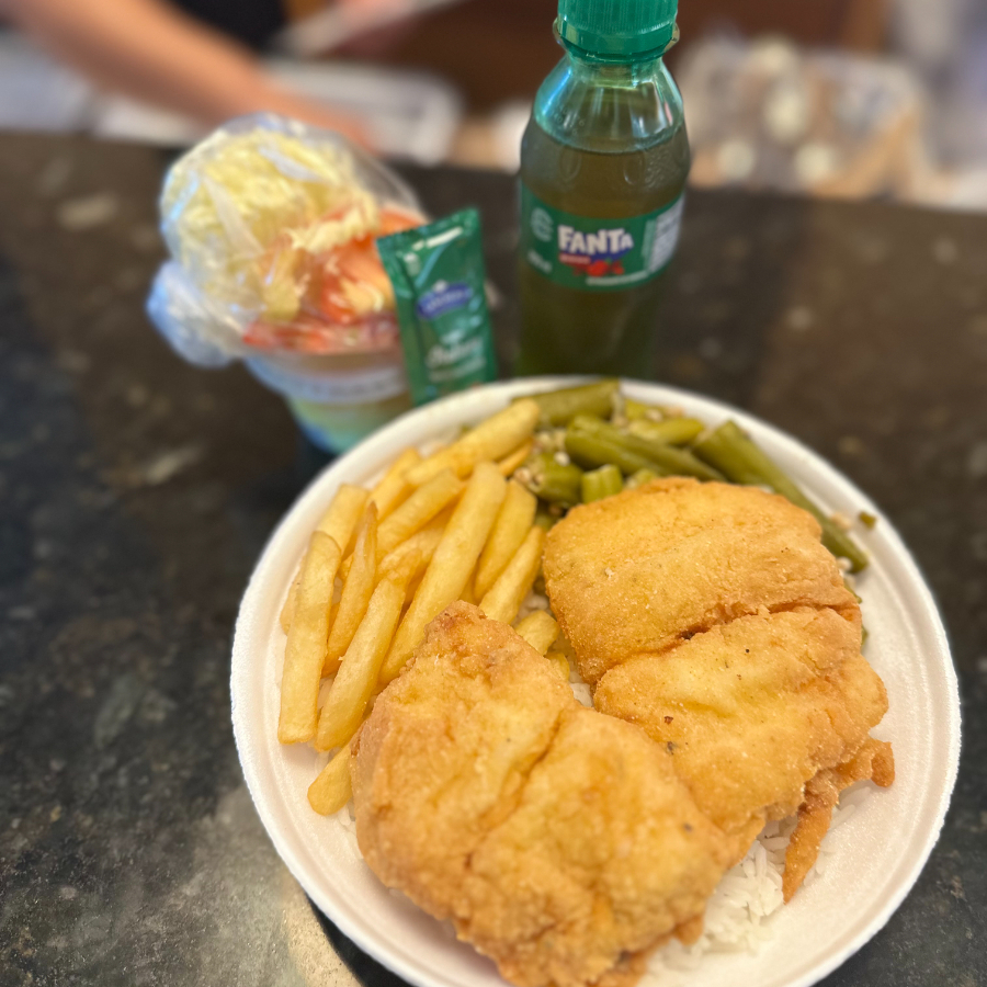 Arroz, feijão, peixe empanado, refogado do dia e fritas. Acompanha Salada e Sobremesa.
