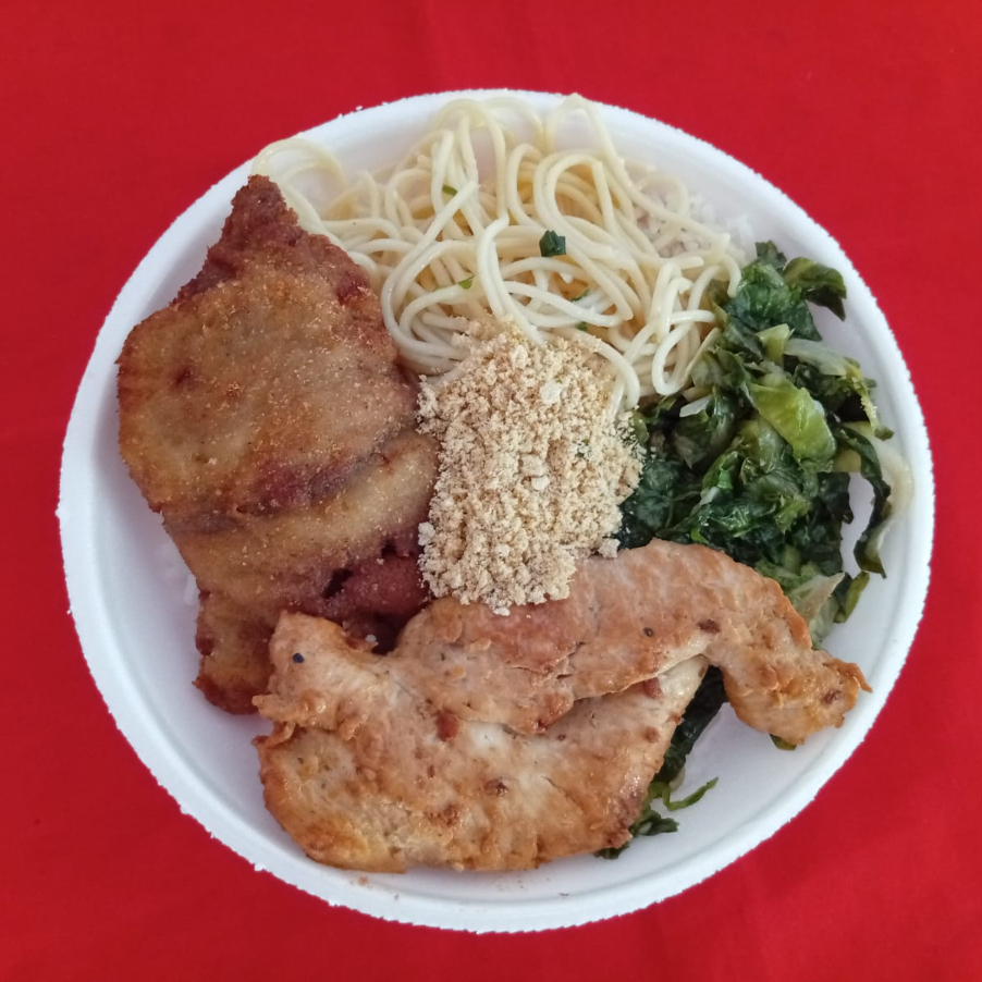 Arroz Feijão Nhoque bolonhesa Frango assado Pernil Creme de milho Refogado abobrinha