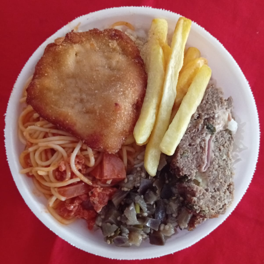 Arroz Feijão Macarrão com linguiça Rocambole de carne Frango a milanesa Batata frita Refogado de beringela Farofa