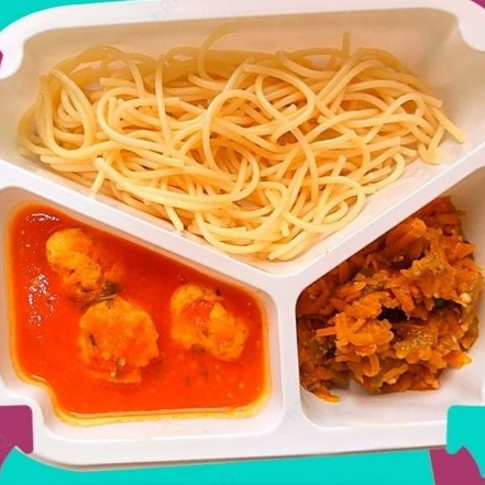 Macarrão sem ovos, berinjela com cenouras refogadas e almondegas de frango