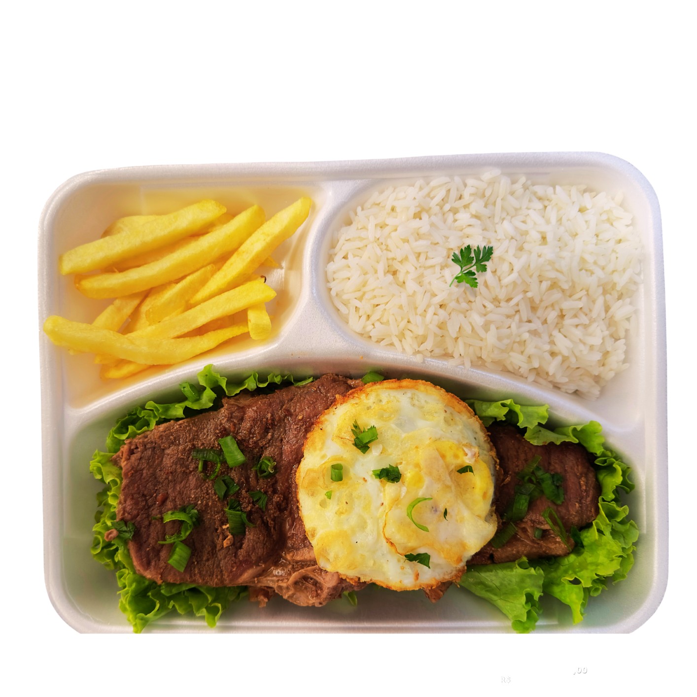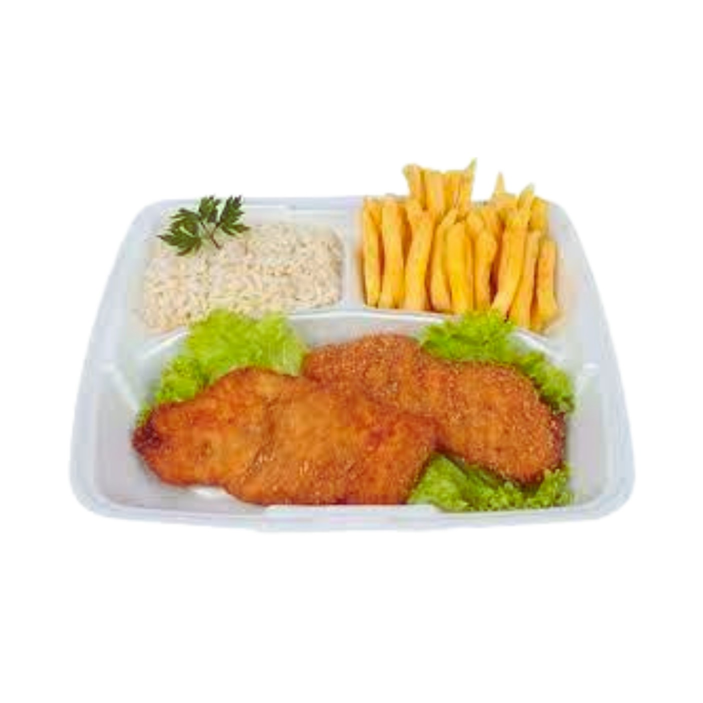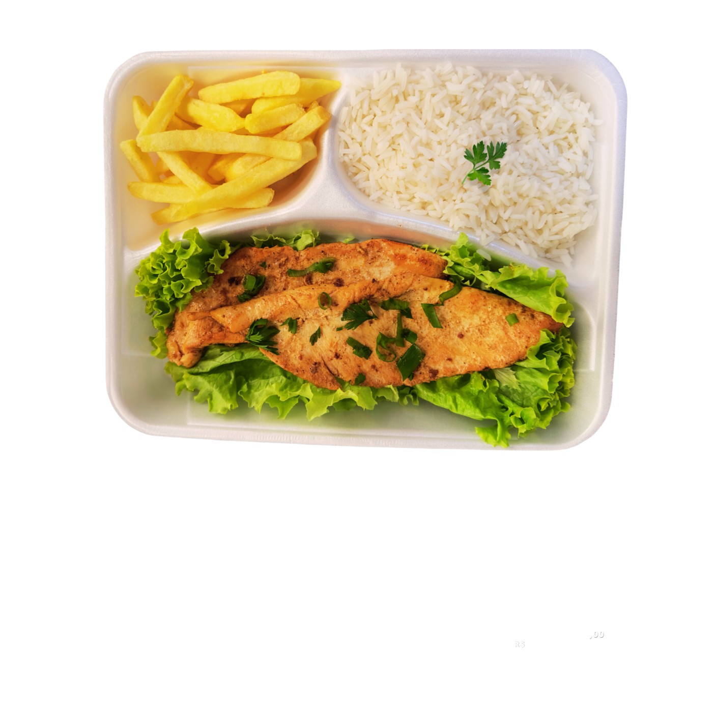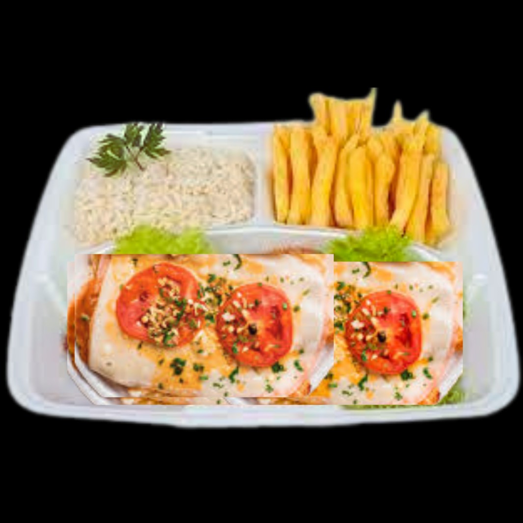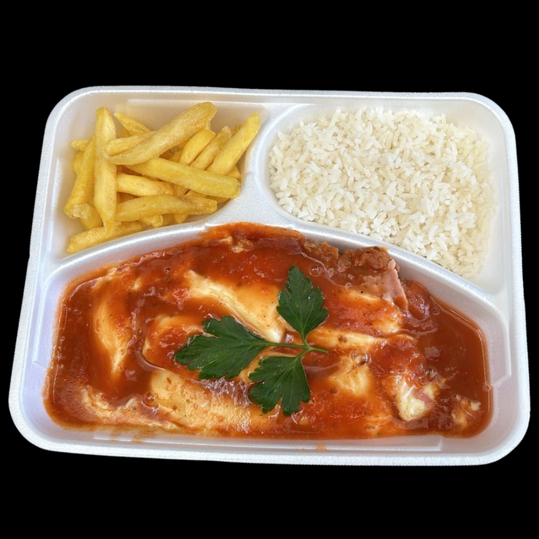 - PARMEGIANA DE FRANGO (Filé de Frango empanado e frito, coberto com mussarela, presunto e molho de tomate) - BATATA FRITA - ARROZ BRANCO * ACOMPANHA: SALADA + MOLHO DE ALHO ** embalagem de isopor com divisórias ***foto meramente ilustrativa