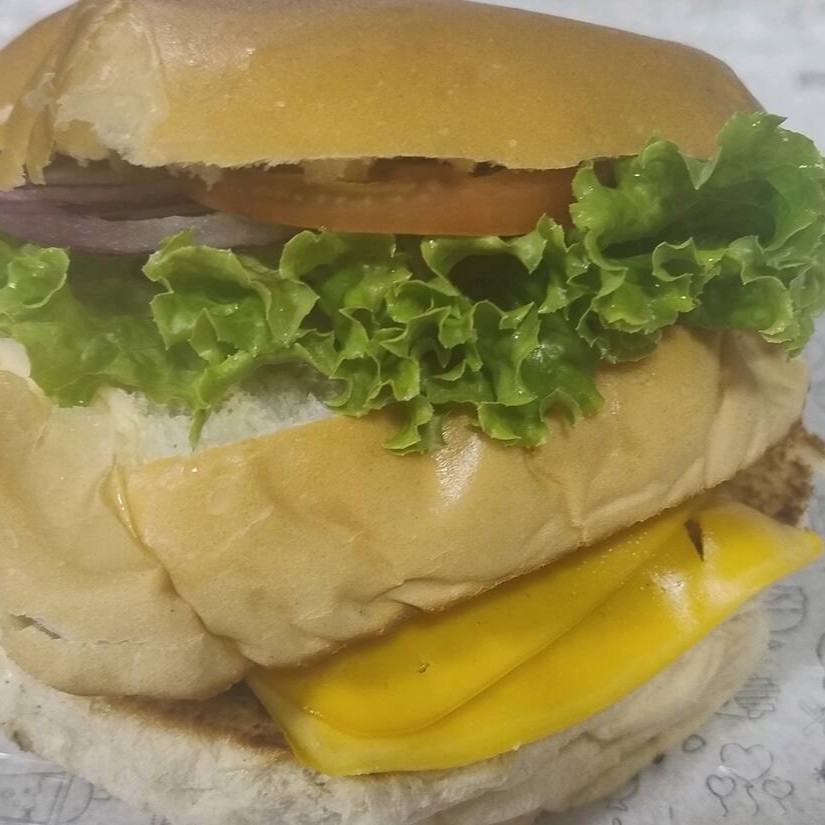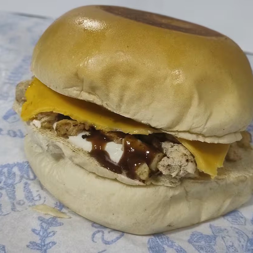 Pão de hambúrguer, file de frango ,barbecue , molho verde , queijo prato .