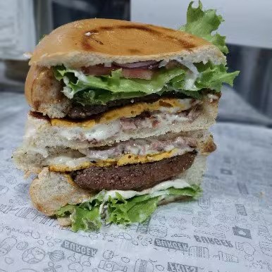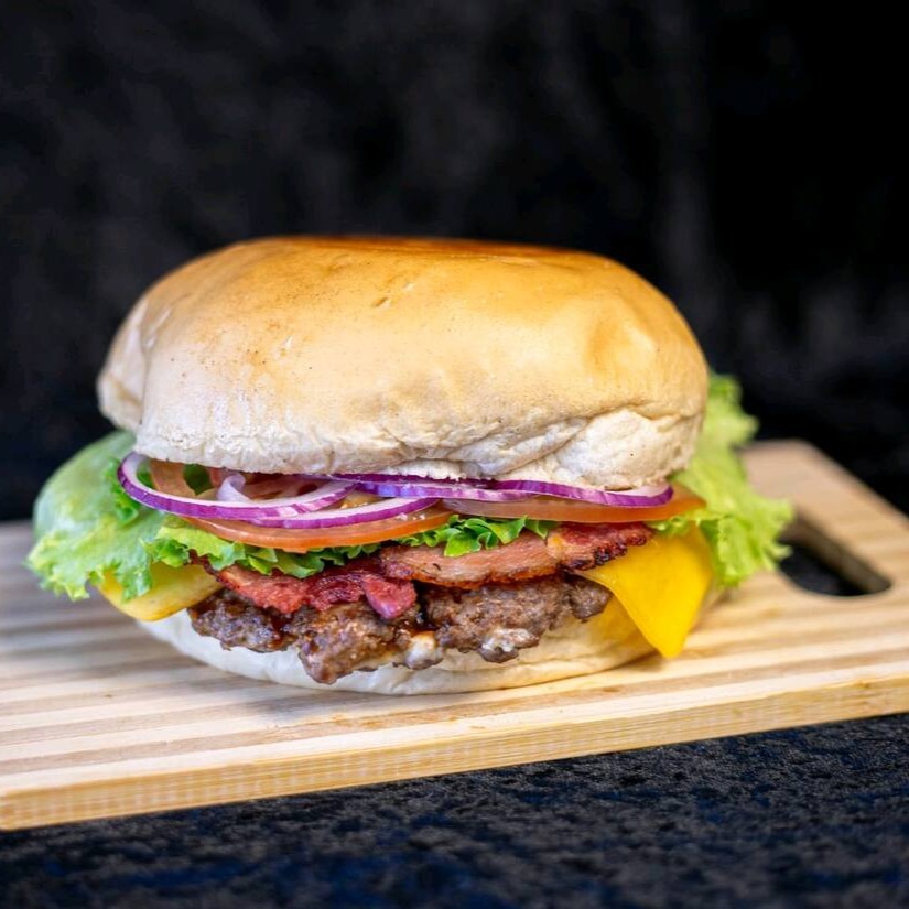 Pão, hambúrguer artesanal, ovo, bacon, queijo, salada e molho especial.