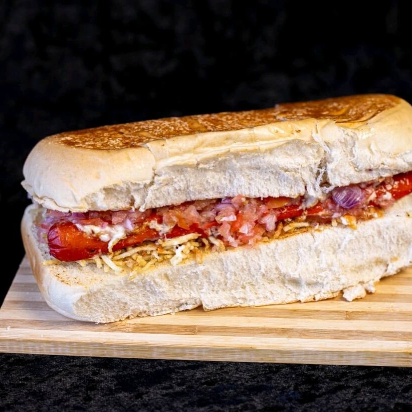 Pão de hot, 1 salsicha, vinagrete, batata palha , molho verde, mostarda , ketchup.