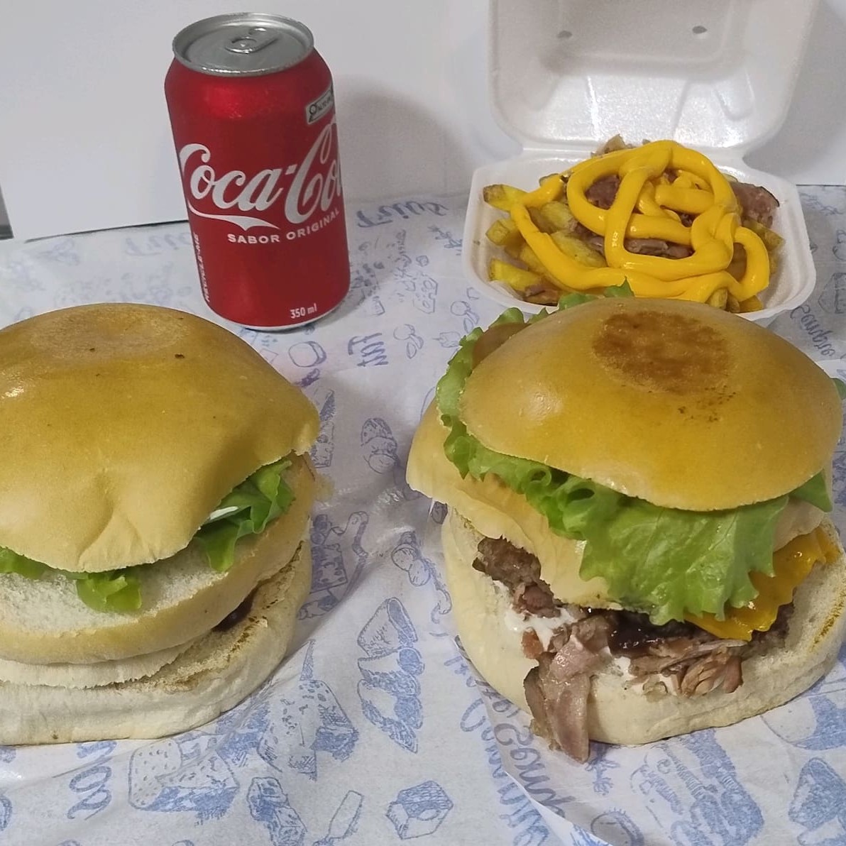 Pao de hambúrguer, molho verde , bacon ,hambúrguer artesanal, alface tomate e cebola roxa (crua) , batata frita com cheddar e bacon e coca Original 350ml